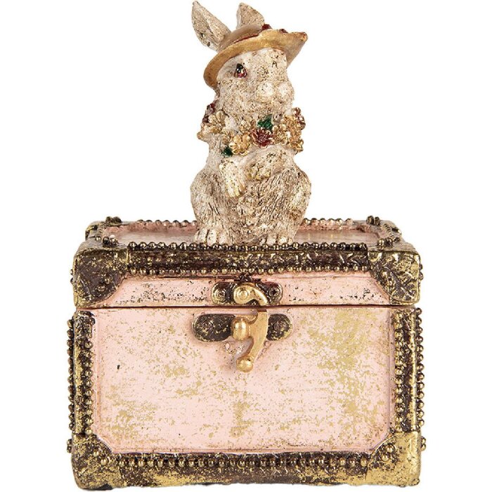 Clayre & Eef decoratief doosje met konijnenfiguur, rijkelijk gedetailleerd in landhuisstijl, polyresin, beige-roze-goud, 12x8x16 cm, ideaal als sieradendoosje of decoratief element