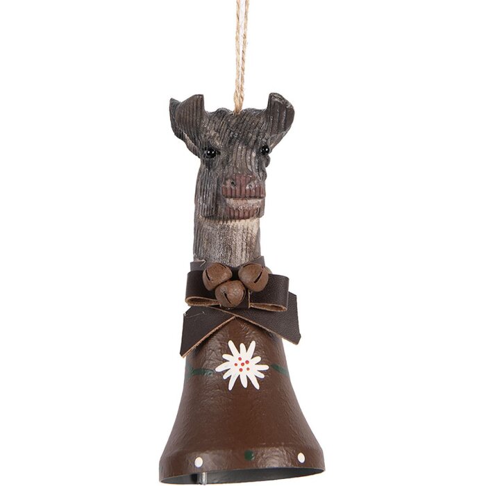 Decoratieve koebel van Clayre & Eef, 7x8x15 cm, retro design, hout & ijzer, met strik, bellen & edelweiss, ideaal voor landelijke huisstijl & cadeau-ideeën