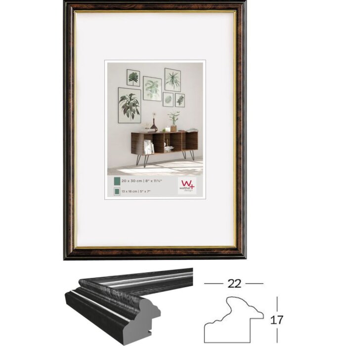 laaggeprijsd polystyreen lijst van Walther, profiel met meerdere groeven en gouden binnenrand, wortelhout-look