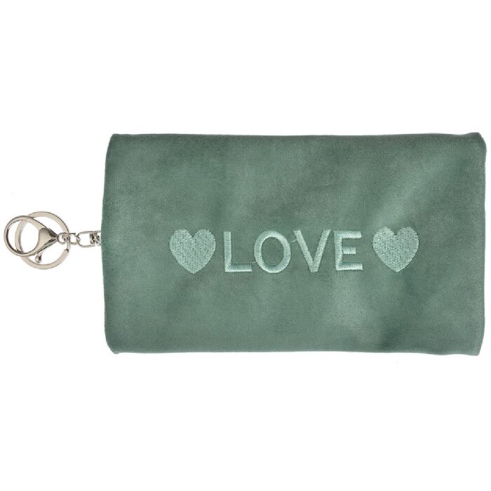 Juleeze JZTB0078 Toilettas, elegant groen, 19 x 1 x 11 cm, zacht synthetisch materiaal, geborduurd LOVE-dessin, met karabijnhaak, perfect voor op reis