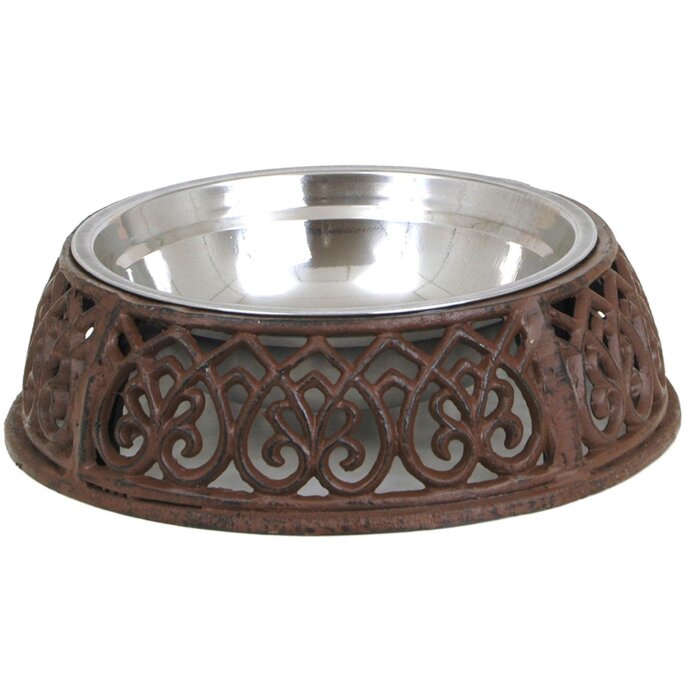 Waterbak en voederbak, gemaakt van metaal, bruin en zilver, frame versierd met ornamenten, ø 27x8 cm