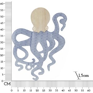 Wandpaneel met 3D octopus, 41x1,5x57?cm, metaal & MDF, naturelkleurige kop, blauw lichaam met patroon, gestanste tentakels, maritiem ontwerp